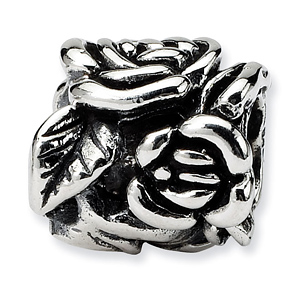 Rose floral bead is made of antiqued, solid sterling silver. This bead fits all major modular bracelet brands. Imported.