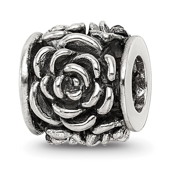 This rose Bali bead is made of antiqued, solid sterling silver. Imported.
