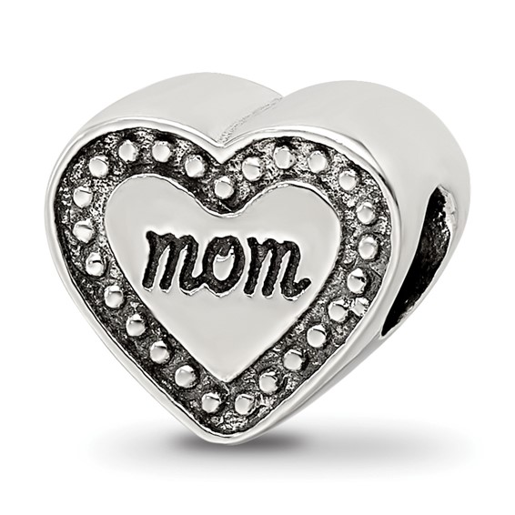 Heart shaped mom bead is made of antiqued, solid sterling silver. Beaded border. Imported.
