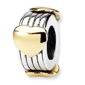 Hearts bead with grooves is made of antiqued, solid sterling silver and 14k yellow gold. This Reflection bead fits all major modular bracelet brands. Import.
