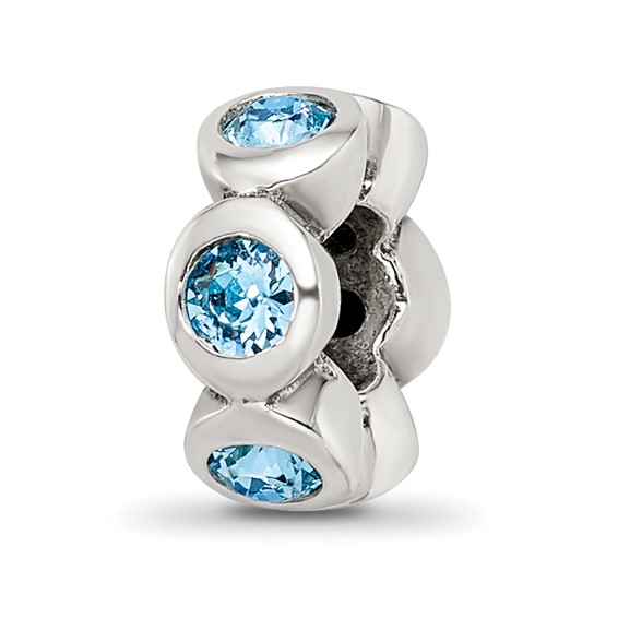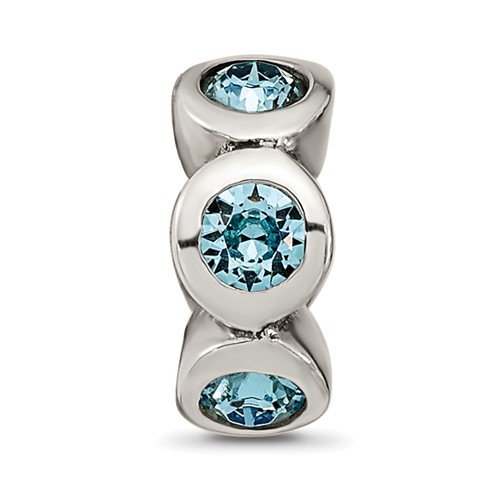 This sterling silver bead features six round Swarovski aquamarine crystals. This Reflection bead fits all major modular bracelet brands. Import.