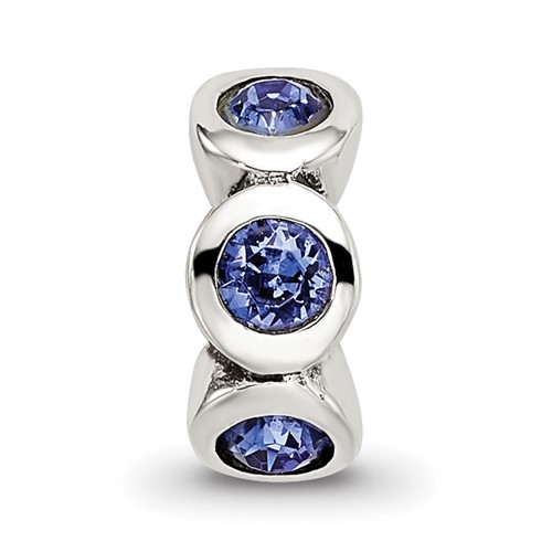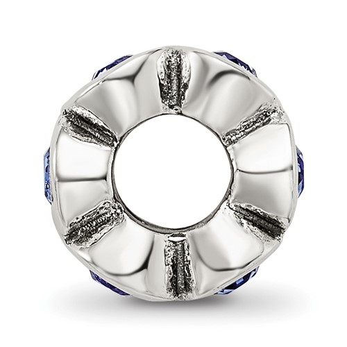 This bead features six round blue Swarovski crystals. Made of antiqued, solid sterling silver. Imported.