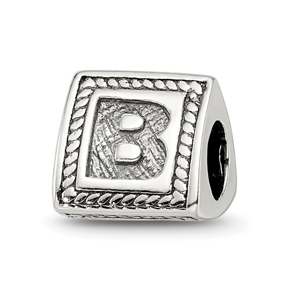 Block letter B triangular bead is made of antiqued, solid sterling silver. Imported.