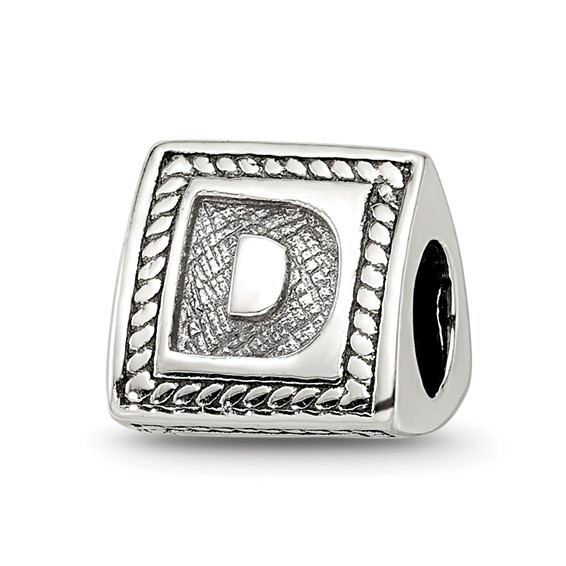 Block letter D triangular bead is made of antiqued, solid sterling silver. Imported.