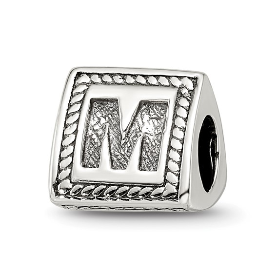 Block letter M triangular bead is made of antiqued, solid sterling silver. Imported.