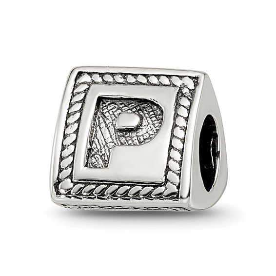 Block letter P triangular bead is made of antiqued, solid sterling silver. Imported.