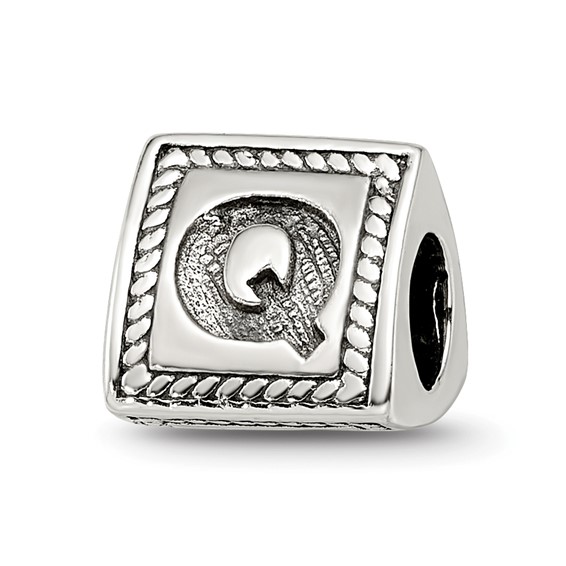 Block letter Q triangular bead is made of antiqued, solid sterling silver. Imported.