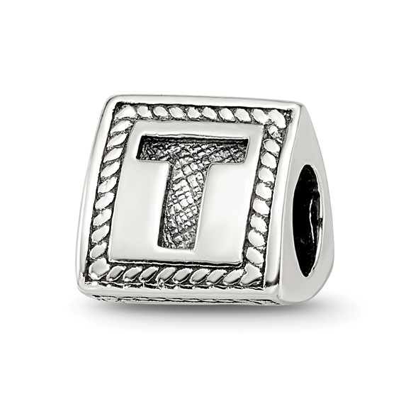 Block letter T triangular bead is made of antiqued, solid sterling silver. Imported.
