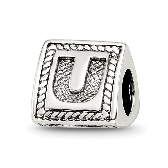 Block letter U triangular bead is made of antiqued, solid sterling silver. Imported.