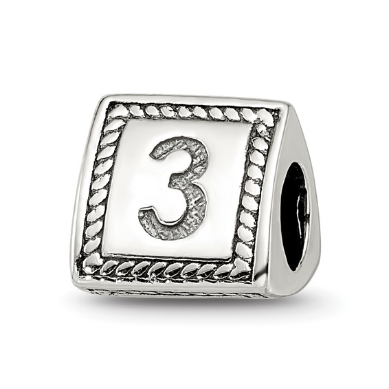 Block number 3 triangular bead is made of antiqued, solid sterling silver. Imported.