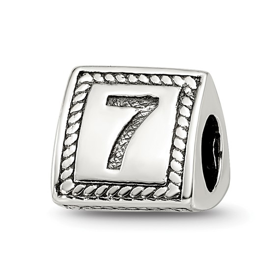 Block number 7 triangular bead is made of antiqued, solid sterling silver. Imported.