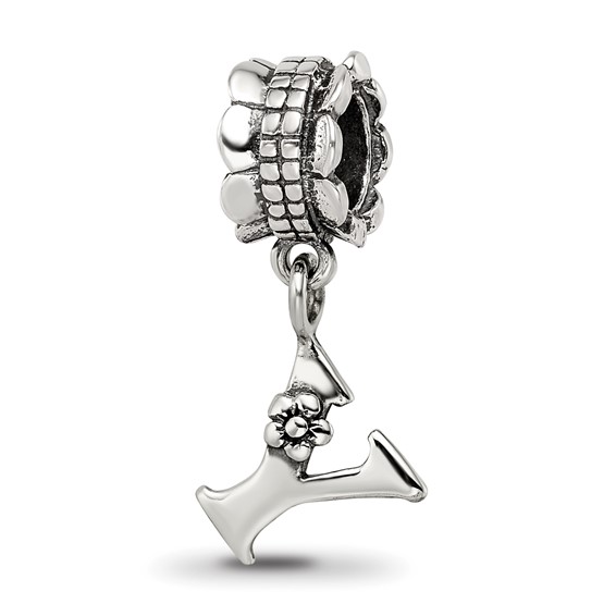 This letter Y dangle bead has flower accents. Made of antiqued, solid sterling silver. Reflection bead fits all major modular bracelet brands. Import.