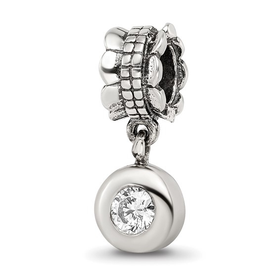 Dangle bead features a white cubic zirconia. Made of antiqued, solid sterling silver. Import.