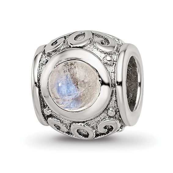 Round fancy moonstone bead is made of antiqued, solid sterling silver. This bead fits all major modular bracelet brands. Import.