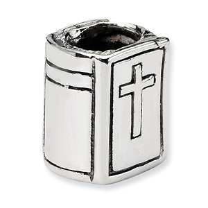 This silver Bible bead is part of the Reflections bead collection. Item measures 6.36mm by 6.36mm with a bead opening diameter of 4mm. Made of antiqued, solid sterling silver. Imported.