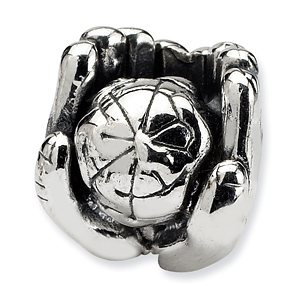 This silver world globe in hands bead is part of the Reflections bead collection. Item measures 10.91mm by 10mm with a bead opening diameter of 4mm. Made of antiqued, solid sterling silver. Imported.