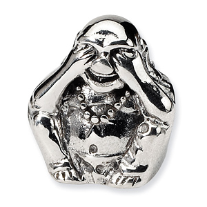 This silver see no evil Buddha bead is part of the Reflections bead collection. Measures 11.82mm by 10mm. The opening is 4mm in diameter. Made of antiqued, solid sterling silver. Imported.