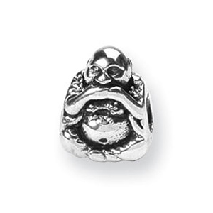 This silver speak no evil Buddha bead is part of the Reflections bead collection. Measures 11.82mm by 8.18mm. The opening is 4mm in diameter. Made of antiqued, solid sterling silver. Imported.