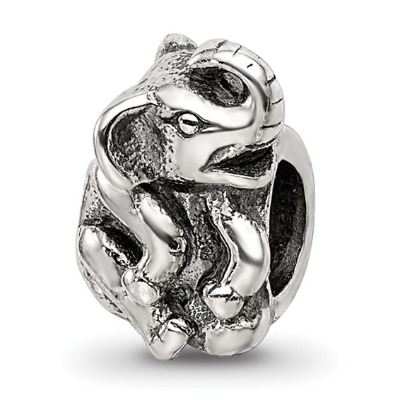This bead is an elephant sitting down. Made of antiqued, solid sterling silver. Imported.