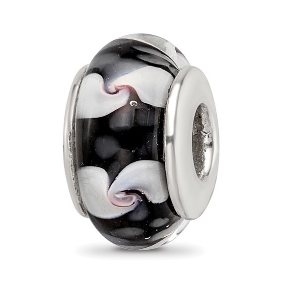This bead is hand blown out of black and white swirl pattered glass. Made of antiqued, solid sterling silver. Color range varies. Imported.