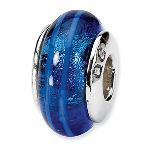 Blue striped hand-blown glass bead is made of antiqued, solid sterling silver. Color range varies. Imported.