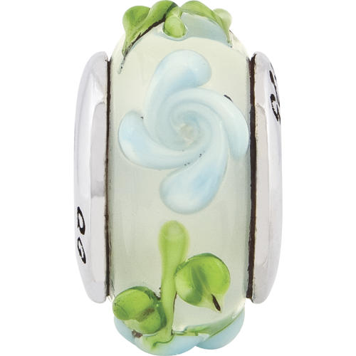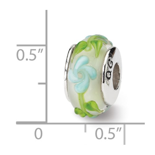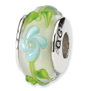 Green and blue floral glass bead is made of antiqued, solid sterling silver. Color range varies. Imported.