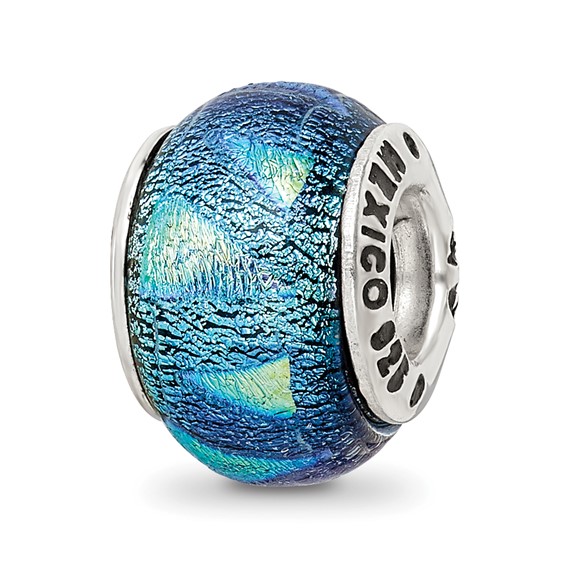 This purple turquoise scaled dichroic glass is glass treated with various metal oxides to make it appear to have many colors. This bead is made of antiqued, solid sterling silver. Color range varies. This bead fits all major modular bracelet brands. Imported.