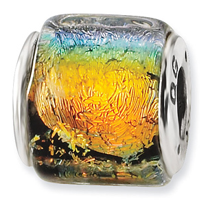 Yellow rainbow shattered look dichroic glass is glass treated with various metal oxides to make it appear to have many colors. This bead is made of antiqued, solid sterling silver. Color range varies. Imported.