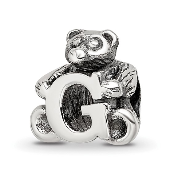 This teddy bear letter G bead is suited for children's bracelets and is made of antiqued, solid sterling silver. Intended for ages 4 and up. Imported.