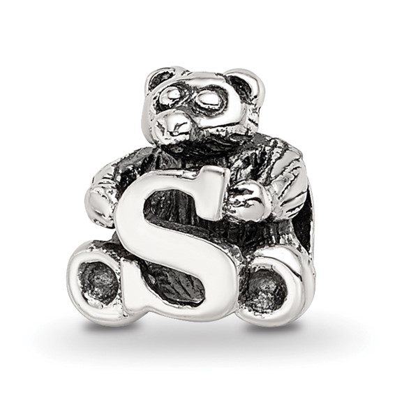 This letter S teddy bear bead is suited for children's bracelets and is made of antiqued, solid sterling silver. Intended for ages 4 and up. Imported.