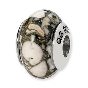 This camo mosaic magnasite stone bead is made of antiqued, solid sterling silver. Bead dimensions: approximately 13.25mm diameter, bead hole: 4.00mm diameter. Imported.