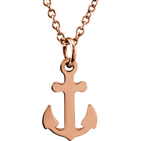 This 14kt rose gold petite anchor pendant dangles from a matching 14kt rose gold 18in cable chain. Spring ring clasp. Pendant size: 10.9mm x 7.2mm.