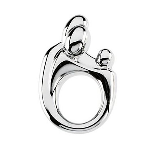 Solid sterling silver mother and child family pendant is designed by Janel Russell. Dimensions: 20.5mm x 13.5mm. This item is slightly larger than a penny. Fits up to a 2.5mm wide chain. Rhodium-plated. Weighs 1.8 grams. Please note: weight is approximate, actual weight may vary. Chain not included. Solid back.