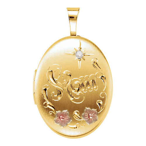 This 3/4 inch oval Mom locket is made of polished, gold-plated sterling silver and engraved with the word Mom. It has a single 1pt diamond accent. This locket holds two photos. Dimensions: 19.2mm x 15mm. This item is the size of a penny. Weighs 2.8 grams. Please note: weight is approximate, actual weight may vary. Chain not included.