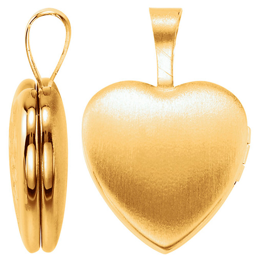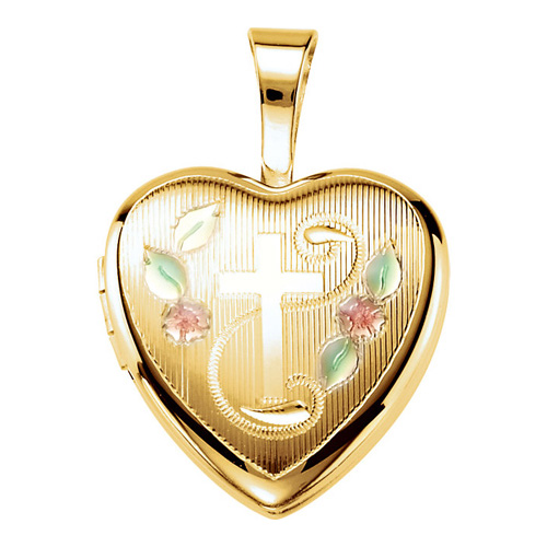 Polished, gold-plated sterling silver heart locket is engraved with a cross, red flowers and green leaves on the edges. This petite locket holds two photos. Dimensions: 12.5mm x 12mm. This item is half the size of a quarter. Weighs 1.4 grams. Please note: weight is approximate, actual weight may vary. Chain not included.