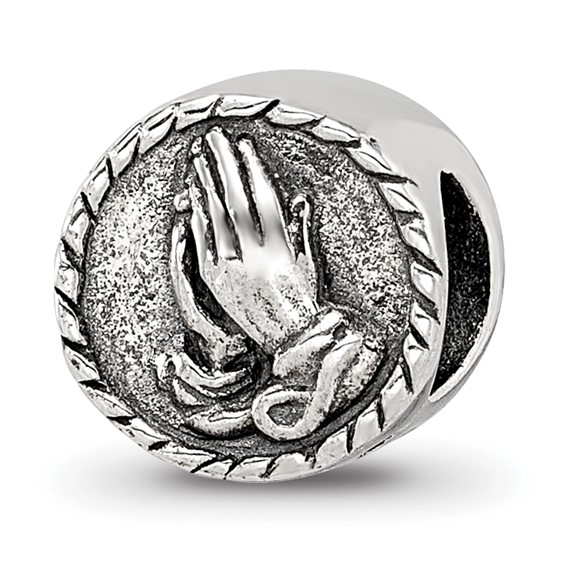 This praying hands bead is made of antiqued, solid sterling silver. This bead fits all major modular bracelet brands. Bead size: 8.1mm x 8.1mm. Hole size: 4mm. Imported.
