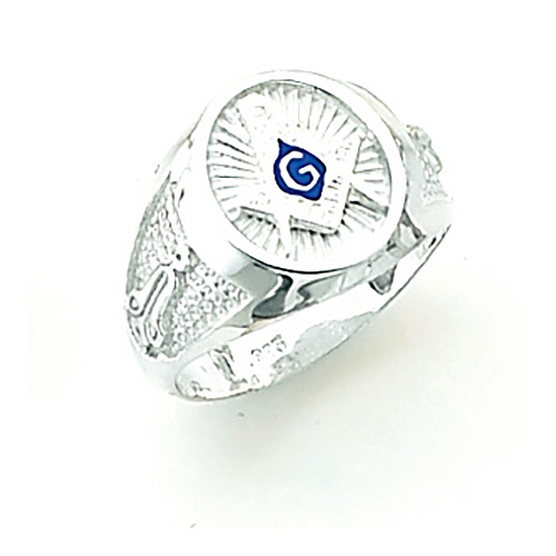 Open or solid back, polished 10kt white gold ring with Masonic compass and set square symbol. Oval sunburst top. Tapered shank with side emblems. Plumb bob and trowel side emblems. Made in USA.
