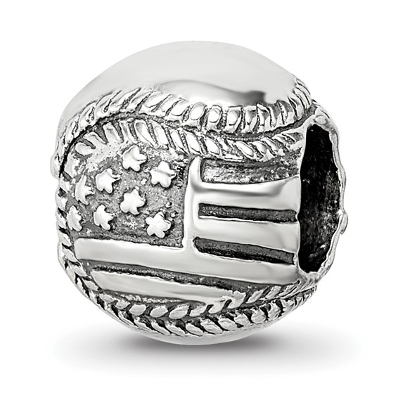 American flag baseball bead is made of antiqued, solid sterling silver. This bead fits all major modular bracelet brands. Imported.