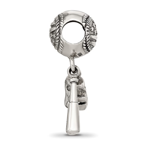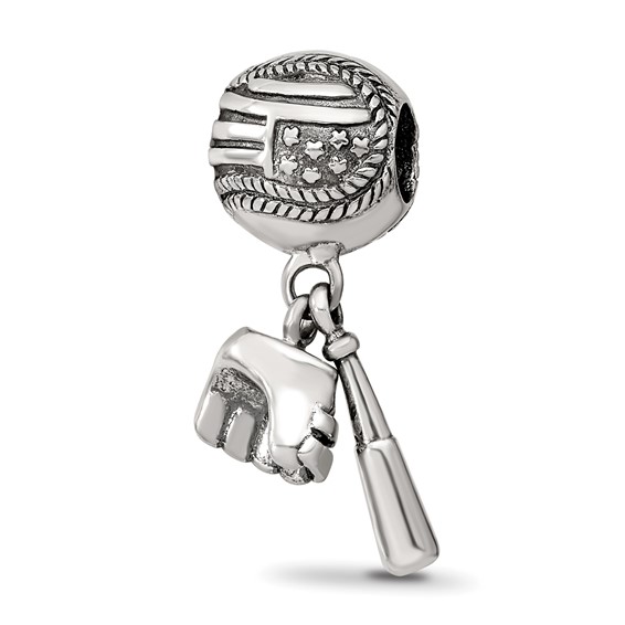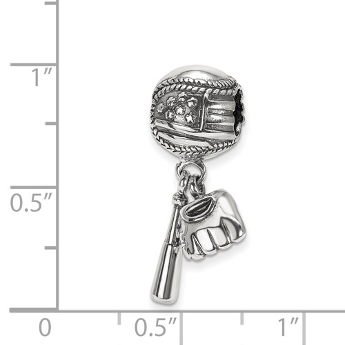 Baseball bat glove and baseball bead is made of antiqued, solid sterling silver. This bead fits all major modular bracelet brands. Imported.