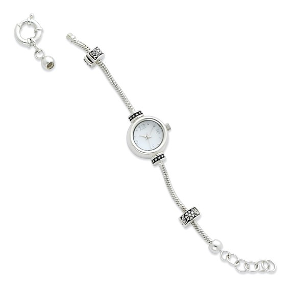 This 8 to 9 inch sterling silver watch and bracelet is made especially for Reflection Beads, but is compatible with other leading brands. The bracelet is adjustable between 8 to 9in, and boasts a spring ring clasp. Imported. Watch has a mother of pearl dial and sterling silver case with stainless steel caseback. Quartz movement. Two clip beads are included in this lovely set.Fit guide: for correct bracelet length, measure your wrist and add an extra 1 to 1 1/2in to allow for width of beads.