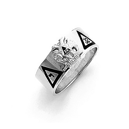 Solid back, polished 14kt white gold ring with Scottish Rite double eagle, 32nd degree, and yod symbols. Blue enamel side emblems. Width: 8mm. Made in the USA. Standard fit.
