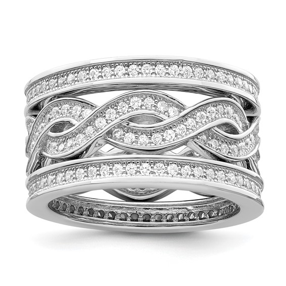 This 3 piece infinity ring set is polished sterling silver set with high quality micro pave cubic zirconia. Available in whole finger sizes 6, 7, and 8 only. Dimensions: 5mm x 20mm. Weight: 7.71 grams.