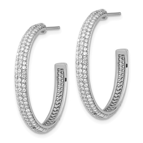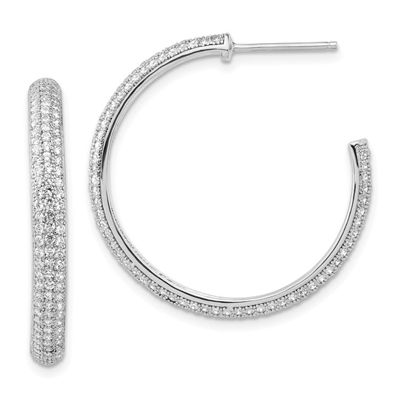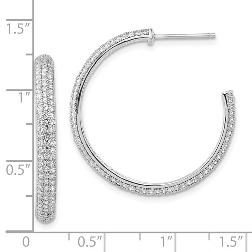 Polished sterling silver hoop earrings are encrusted with high quality micro pave cubic zirconia. Earring size: 1 inch. Thickness: 4mm. Posts with push on / pull off backs. Weight: 4.92 grams. Available while supplies last.