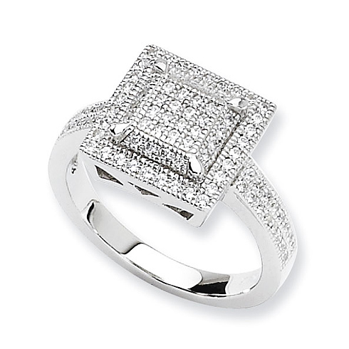 Polished sterling silver ring has a square top set with high quality micro pavé cubic zirconia. Available in whole finger sizes 6, 7, and 8 only. Ring top dimensions: 11mm x 11mm. Weight: 4.65 grams.