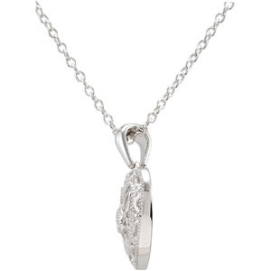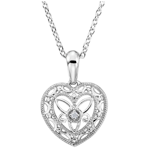 Polished sterling silver necklace is set with genuine round diamond accents. Diamond details: 1 x 0.010ct, 4 x 0.008ct, I2 clarity. 18in sterling silver cable chain, 1.0mm wide. Item weight: 1.40 grams.