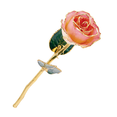 Lacquer dipped cream rose with gold trim measures 12in long and is packaged in a lovely gift box. Beautiful real roses are hand picked then treated through a delicate electro-form process to protect and preserve their natural beauty. Each rose is individually dipped in lacquer and trimmed in 24kt gold. These unique and natural flowers make a gift that will be treasured for many years to come.