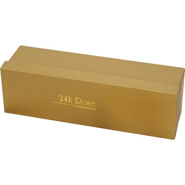 Real semi-opened rosebud is plated with 24kt yellow gold. Approximately 12in long. Each rose is elegantly wrapped in gold tissue and packaged in a gold, two-piece, presentation box.