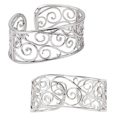 One size fits most women. Polished sterling silver set with diamond accents. Weight: 44 grams. Diamond details: 46 x 0.006Ct (1.1mm), I1 clarity round diamonds.
