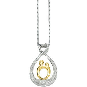 Polished gold-plated sterling silver Mother and Child necklace is adorned with genuine diamond accents. Necklace length: 18in. Diamond details: 19 x 1mm, I-J round diamond stones. Item dimensions: 26mm x 15.5mm, slightly larger than a quarter. Weight: 4.74 grams.