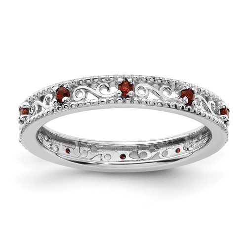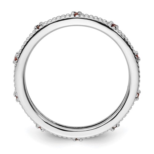 Garnet eternity ring is made of polished sterling silver. Approximate gemstone total weight: 0.22 carats. Metal weight: 2 grams. Width: 3.0mm. Available in whole finger sizes only, 5-10. Imported. Part of the Stackable Expressions collection.